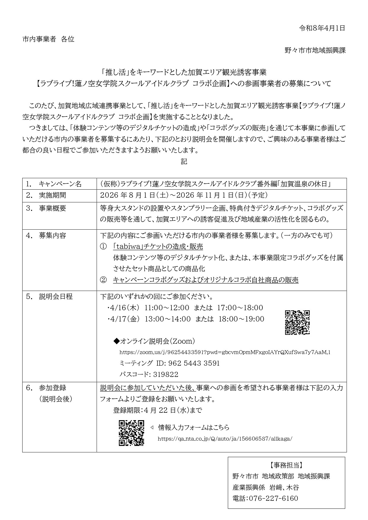 加賀地域広域連携事業【ラブライブ!蓮ノ空女学院スクールアイドルクラブ コラボ企画】への参画事業者の募集について