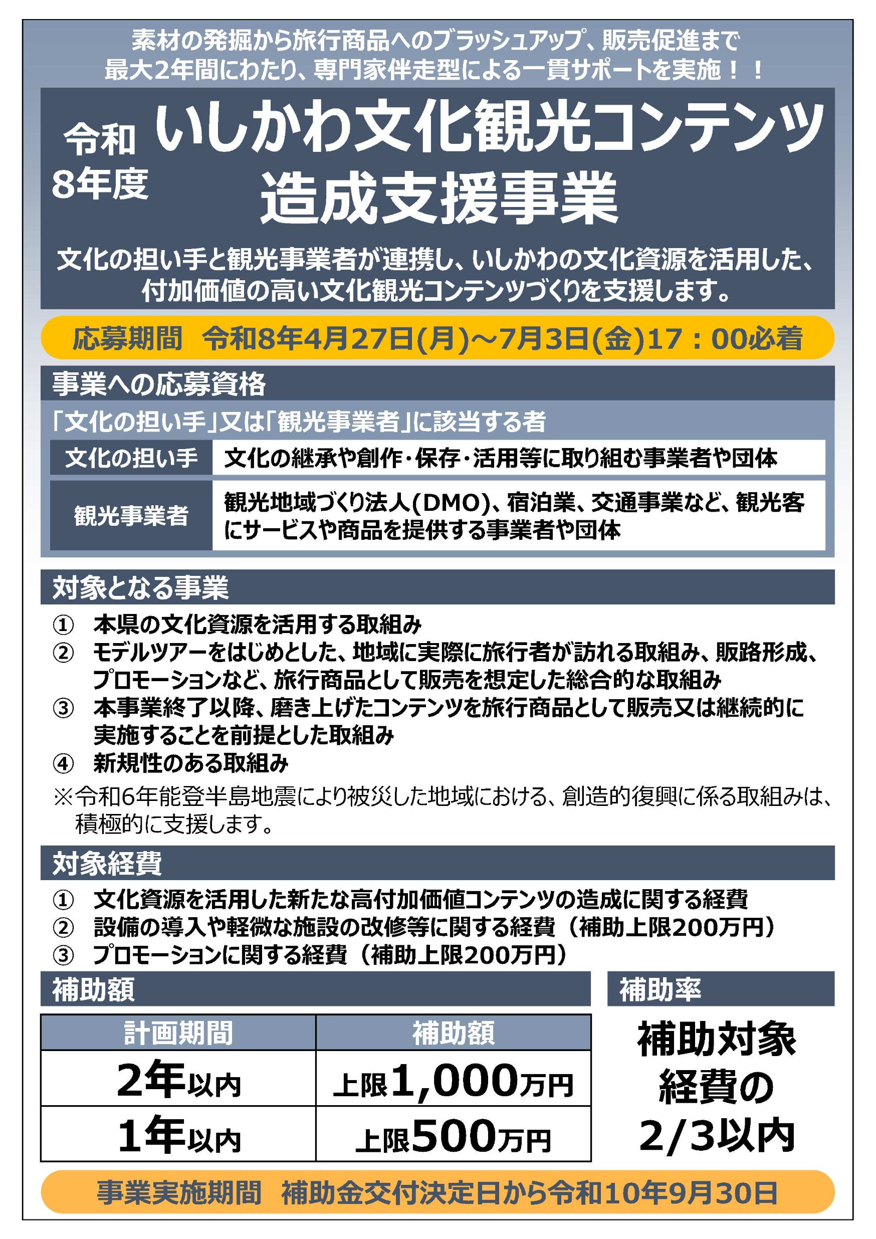 ◆R8年度「いしかわ文化観光コンテンツ造成支援事業」
